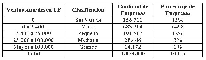 El Servicio de Impuestos Internos clasifica a las empresas según su nivel de ventas en Sin Ventas, Micro, Pequeñas, Medianas y Grandes. Al cierre del año 2016, la cantidad de empresas en Chile es la que se muestra en el siguiente cuadro: