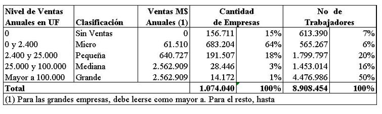 Sin embargo, si utilizamos la definición o clasificación, en función del tamaño que utiliza el Servicio de Impuestos Internos (SII), llegamos a números muy diferentes. El SII clasifica a las empresas según su nivel de ventas en: